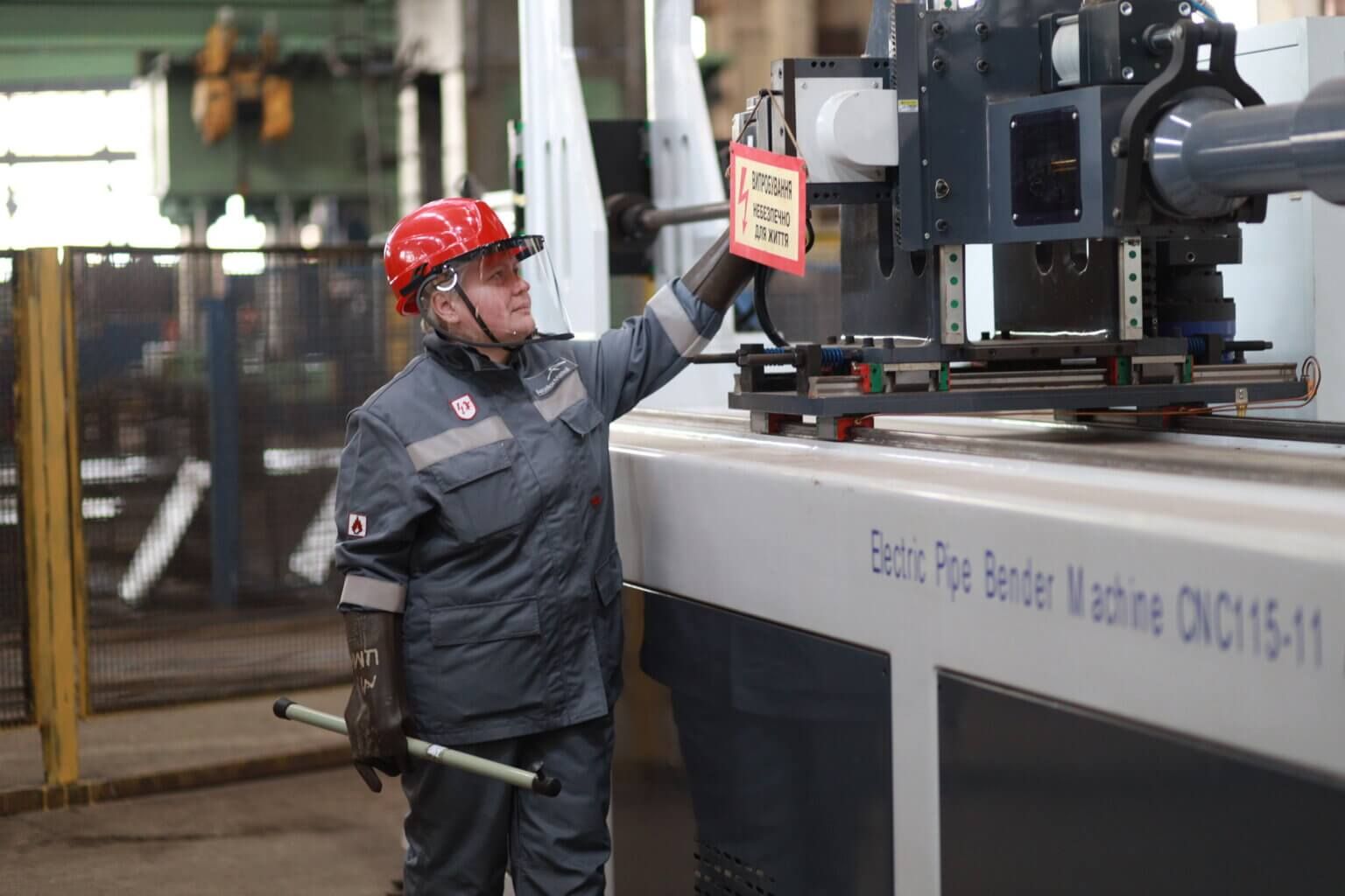 Електромонтерка з ремонту та обслуговування електроустаткування Олена Калієвська обслуговує електроустаткування ЦМК та ремонтує його. Електромостові крани, вальці, верстати, ножиці, преси, металорізальні машини і дуже багато зварювального устаткування – це все працює завдяки електричному струму. А ще є три підстанції, які перетворюють струм з напругою 6000 вольт на 0,4 кВ. Саме устаткування підстанцій є найнебезпечнішим щодо виникнення електродуги, хоча Олена зізнається, що все електроустаткування небезпечне. Елегантно сидить на ній новенький костюм.