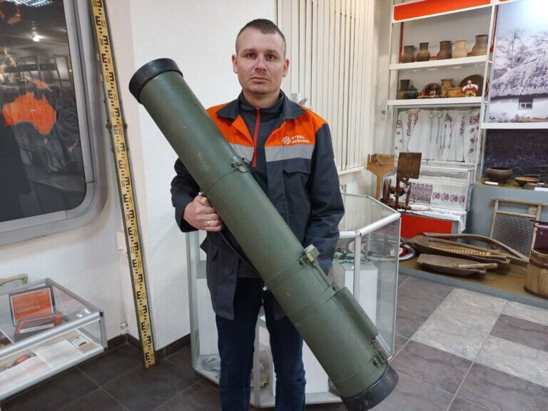 Побачити на власні очі та доторкнутися до знищених бойових засобів ворога, за допомогою якої росіяни намагалися атакувати Криворіжжя, можна у музеї історії нашого підприємства. Нещодавно колекція уламків ворожої зброї поповнилася новим експонатом – тубусом від снаряда рашистського протитанкового ракетного комплексу «Корнет».