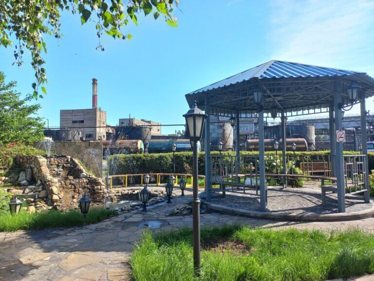 Серед промислового ландшафту, раптом – шум води каскадного фонтану, голуби, які прилітають сюди попити водички та вмочити лапки, алеї запашних троянд та хвої, дерева, яскраво зелені газони та велика затишна альтанка, яка дарує таку бажану влітку тінь. Такою ми побачили зону відпочинку, створену у коксовому цеху № 1. Вона була відкрита ще за часів введення в дію реконструйованих коксових батарей №№ 5,6. Але з кожним роком цей куточок природи удосконалюється.